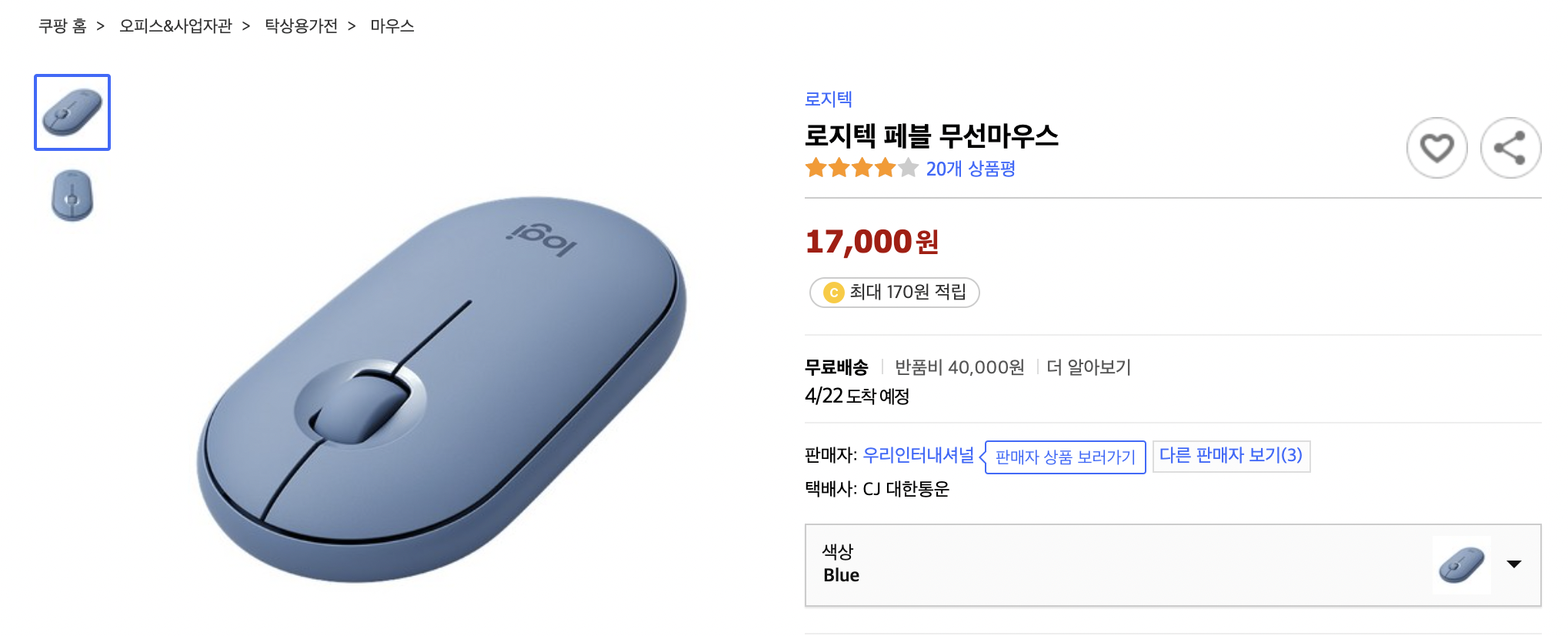안녕하세요. 오늘은 쿠팡에서 구매하게 된 가성비 무소음 마우스, 로지텍 페블 마우스를 다시 구매하게 된 후기를 올리려고 하는데요. 사실 저는 이 마우스를 이전에 구매했던 적이 있었습니다. 너무 열심히 쓴 나머지 1년만에 왼쪽 버튼이 잘 눌리지 않아 잘 쓰지 않게 되었는데요. 당시에 구매했던 가격은 3만원이 안됐습니다.