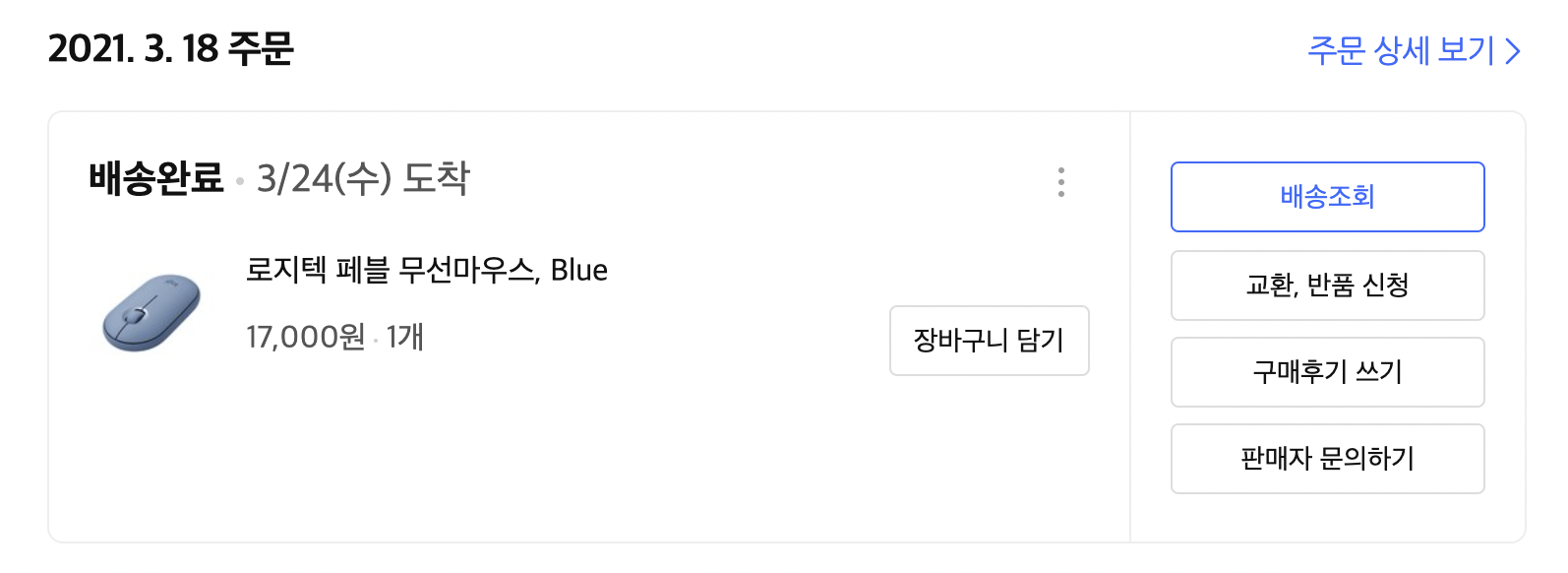 중국에서 오는 제품들은 대부분 6일 정도는 걸리는 것 같습니다. 전에 구매했던 온도계도 그랬고 곧 리뷰할 베이서스의 노트북 거치대 또한 6일 이상 소요됐으니 말이죠. 3월 18일에 주문해서 3월 24일에 도착한 페블 마우스, 요즘 중국에서 주문하는 게 가격이 저렴하다보니 많이 주문을 하는 것 같습니다. 정말 신기한게 저때만 해도 페블 마우스가 이 가격보다 저렴하면 짝퉁소리밖에 없는 제품들이 많았는데 지금은 쿠팡에서 11,000원이면 정품을 구매하는 제품이 검색됩니다. 억울하지만...