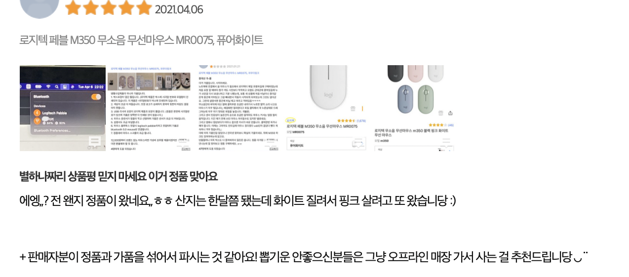 제가 정확히 결론을 내리자면 이것은 로지텍의 기술과 동일하게 만들어진 제품일지라도 정품은 아니라는 것입니다. 그러나 이 제품을 환불할 생각까지는 없습니다. 작동은 잘 하기 때문이죠. 어떤 분들의 리뷰는 정품이 왔다고는 하는데 그건 정말 운이 좋은 분들이네요. 그래서 뭐 크게 불만은 없습니다만 결국 정품을 쓰기 위해서는 환불을 하시고 정품이 올때까지 다시 구매하는 방법? 이것이 유일한 로지텍 페블 마우스를 저렴하게 구매하는 방법이라고 말씀드립니다. 시간은 걸리겠지만 말이죠. 그런데 저렴한 제품을 구매하려고 시간을 계속 들이는 것을 좋아하는 편은 아니다보니 기능상 큰 하자가 없기 때문이 계속 사용하게 되더라고요.