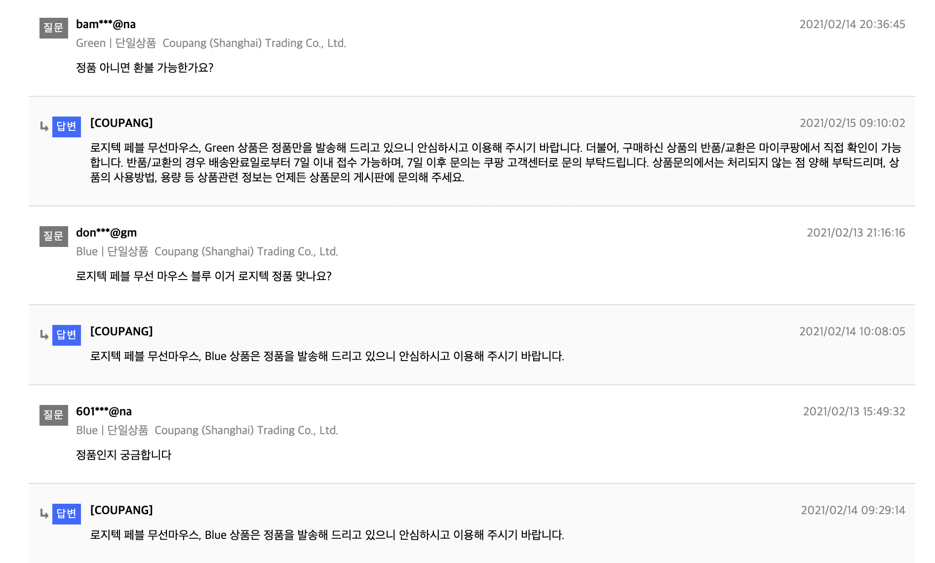 만약 이분 말대로 제 제품이 가품이라면 그냥 대충 쓰다가 고장나면 오프라인 매장에서 사야할까 싶기도 했습니다. 그래도 제가 구매했던 로지텍 페블 마우스 구매 페이지 또한 로지텍 이란 태그가 존재하기때문에 진품이 아닐까 생각도 해봤습니다. 일단 Q&A 에 질문을 올려놓고 답변을 올렸습니다. 설마 제가 말한 블루투스 신호가 BT 5.0 마우스 라고 나오는 제품이 정품이라고 답변을 달까 싶기도 한데요. 제품을 판매하는 담당자들이 계속 정품이라고 답변을 하는 이유는 그럴만한 이유가 있지 않을까 싶기도 하면서 이러한 가품 의심을 할만한 내용을 차라리 상품 페이지에 정확한 공지를 하는 것이 나을것인데도 불구하고 공지를 하지 않는 것에 대한 의심도 되는 부분입니다.
